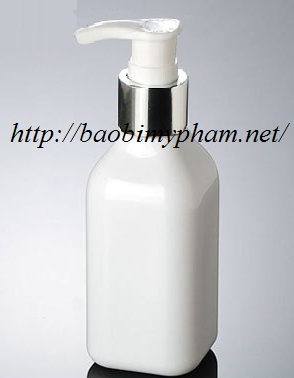 Chai vuông trắng cổ cao - vòi nhấn bơm sữa tắm bọc nhôm bạc 200ml